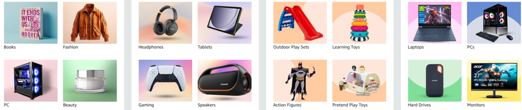 - Fashion and beauty: clothing, shoes, jewelry, and personal care items for men, women, and children.
